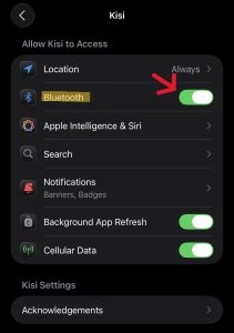 - Bluetooth in iPhone settings under the Kisi app-enabled
