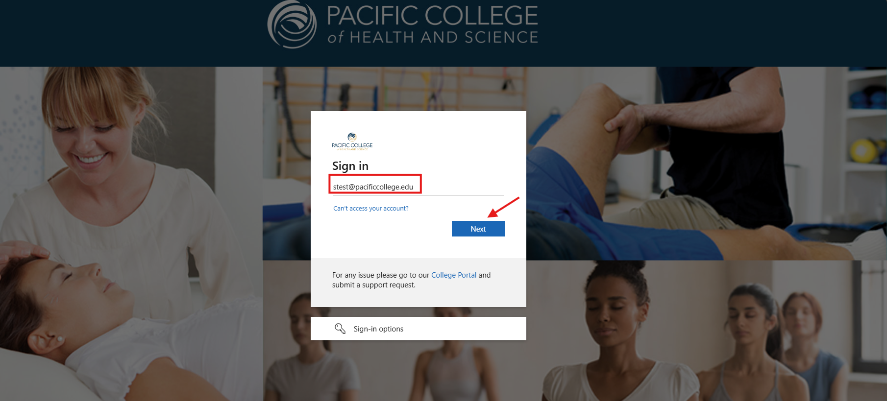 Once you have entered your Pacific College email, please make sure to enter your password correctly.