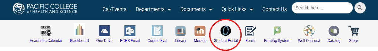 Once logged into the StudentHub system, you will want to click on the icon shaped like an Oval and with the label “Student Portal” (Icon is circled below).